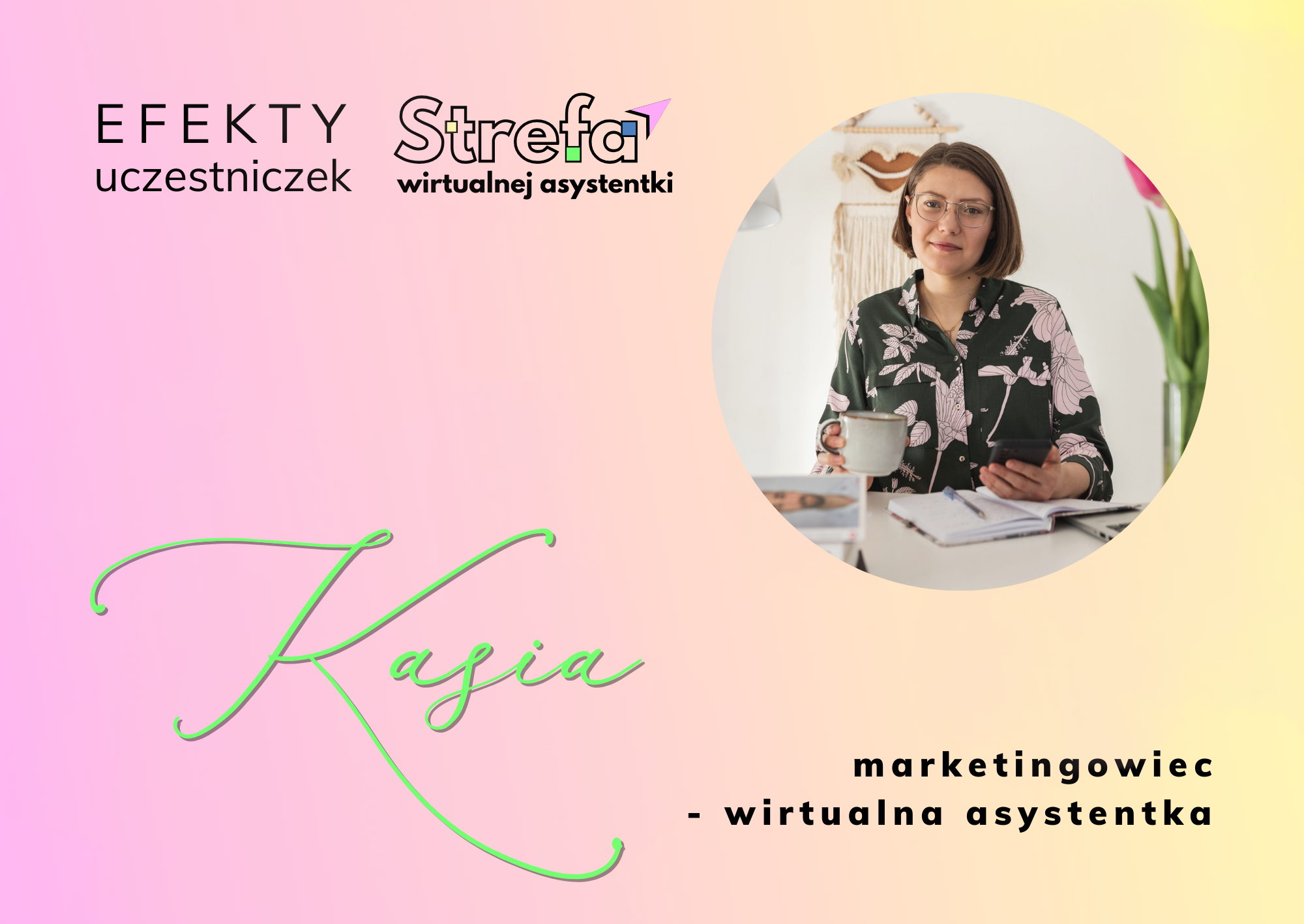Dlatego w maju 2022 r. zdecydowała się zainwestować w swój rozwój w Strefie Wirtualnej Asystentki. Już na początku pracy Kasia stworzyła uporządkowaną, kompleksową ofertę na podstawie swoich specjalizacji i tego, co chce robić dla swoich klientów.